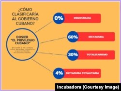 El 100% de los consultados negó que en Cuba hubiera una democracia, en tanto el 18% lo calificó de una dictadura y el resto respondió de manera aleatoria entre totalitarismo y dictadura totalitaria.