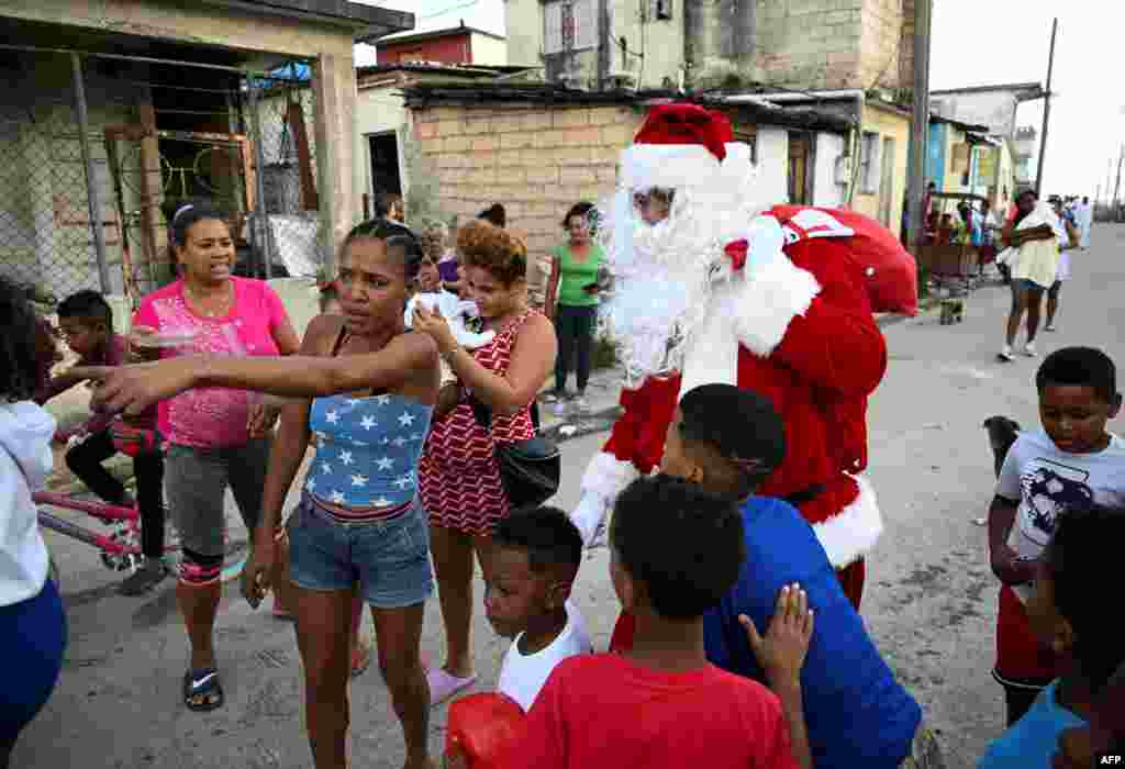 Un hombre vestido como Papá Noel o Santa Claus camina junto a niños cubanos, el 21 de diciembre de 2023. (Foto de Yamil LAGE / AFP)(Foto de Yamil LAGE / AFP)