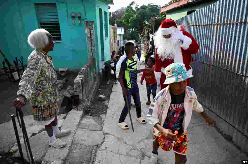 Santa Claus pasa delante de un puesto de viandas, en La Habana.