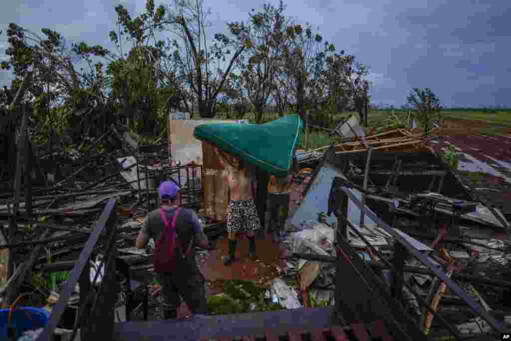 Una familia cubana intenta recuperar algunas pertenencias entre los escombros de una casa destruida tras el paso del huracán Rafael en Alquízar, provincia de Artemisa, Cuba, el 7 de noviembre de 2024.